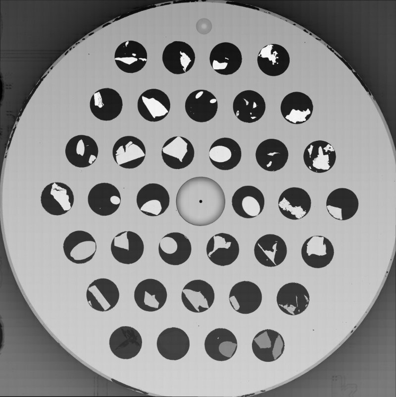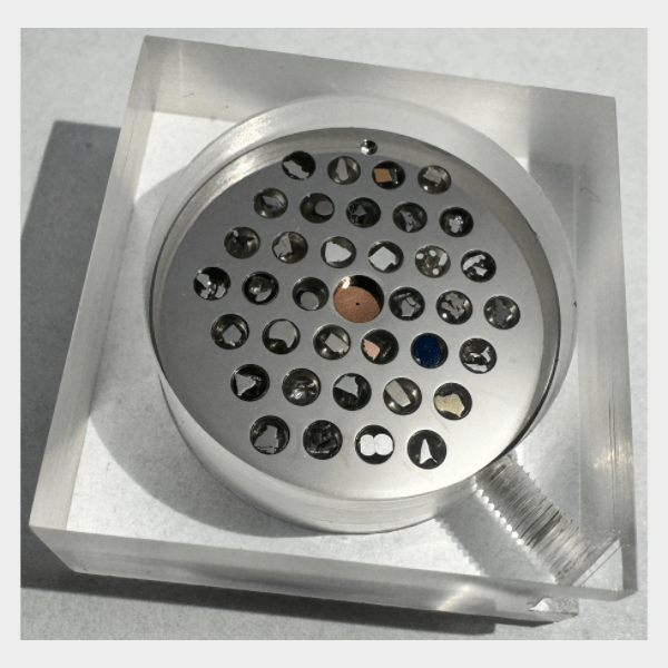 36 metal standards plus Faraday Cup. Mounted and polished in a 24.9 mm diameter, 9 mm high, stainless steel 316L block with M4 at the bottom.