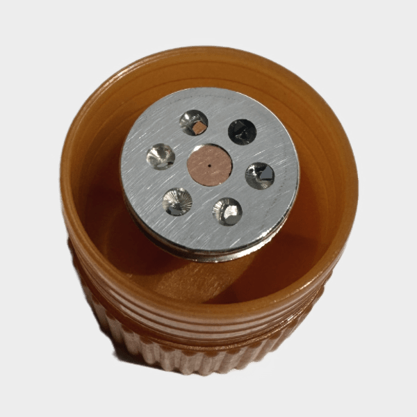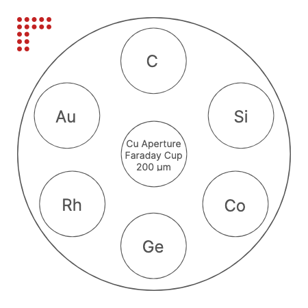 Backscatter Electron Detector calibration standard with 6 materials C, Si, Co, Ge, Rh, Au and a 200 µm Cu aperture on a 12.5 mm aluminum stub.