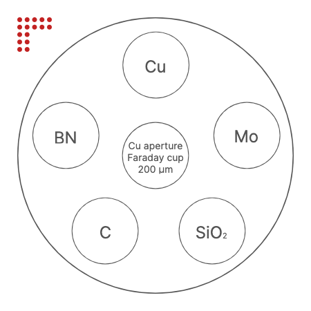 LEX/TEX calibration standard. 5 materials on a 12.5 mm aluminum stub with a 200 µm Cu aperture.
