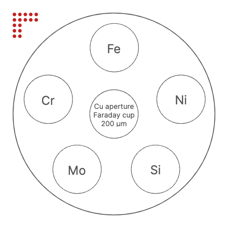 LEX/TEX calibration standard. 5 materials on a 12.5 mm stainless steel stub with a 200 µm Cu aperture.