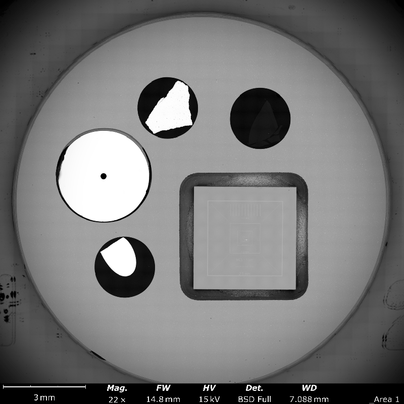 This custom sample was made for a customer who is used to execute SEM system maintenance and calibration (EDS and image magnification) on a 1” sample, this ½”sample is a smaller version.